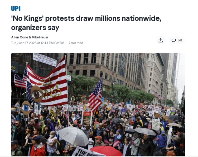 據(jù)美國(guó)合眾國(guó)際社(UPI)6月17日?qǐng)?bào)道,上個(gè)周末,全美多地爆發(fā)約2000場(chǎng)名為“不要國(guó)王”(No Kings)的抗議活動(dòng),組織者稱參與人數(shù)達(dá)數(shù)百萬。