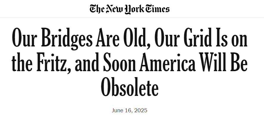《紐約時(shí)報(bào)》6月16日刊發(fā)專欄文章稱,美國(guó)的橋梁、電網(wǎng)和港口等基礎(chǔ)設(shè)施正面臨嚴(yán)重的老化與不足,美國(guó)即將被“老化淘汰”。