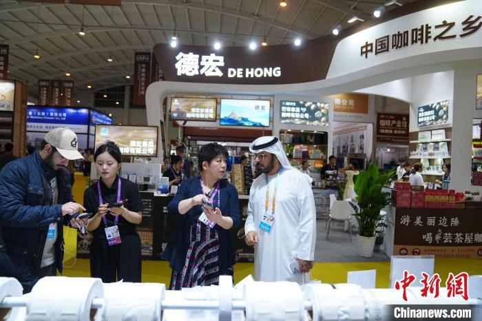 6月19日,來自巴基斯坦的客商在第9屆南博會(huì)咖啡產(chǎn)業(yè)館了解云南咖啡豆。中新社記者 劉冉陽 攝