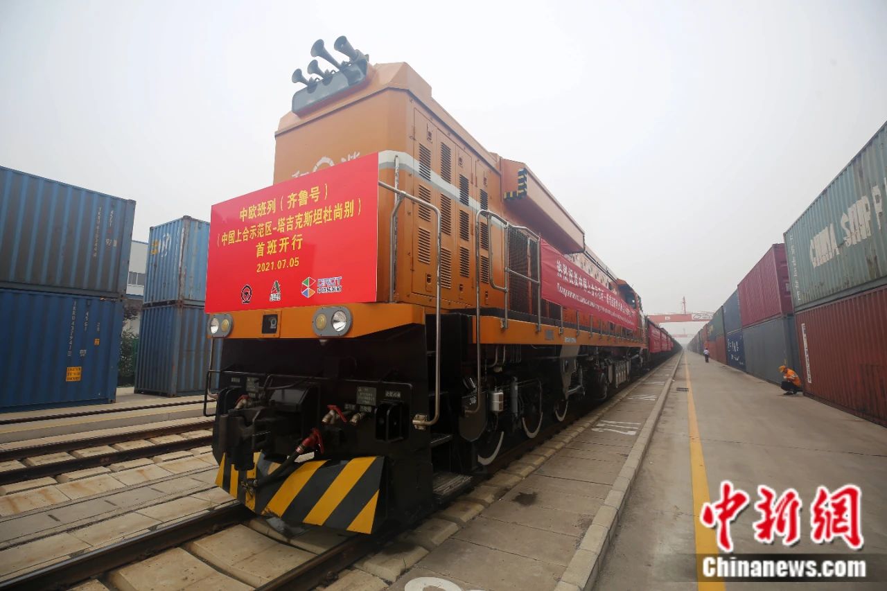 2021年7月5日, 中國—上海合作組織地方經(jīng)貿(mào)合作示范區(qū)(簡稱“上合示范區(qū)”)前往塔吉克斯坦首都杜尚別的首班中歐班列(齊魯號)“上合快線”發(fā)出,從上合示范區(qū)青島多式聯(lián)運中心啟程。中新社記者 胡耀杰 攝
