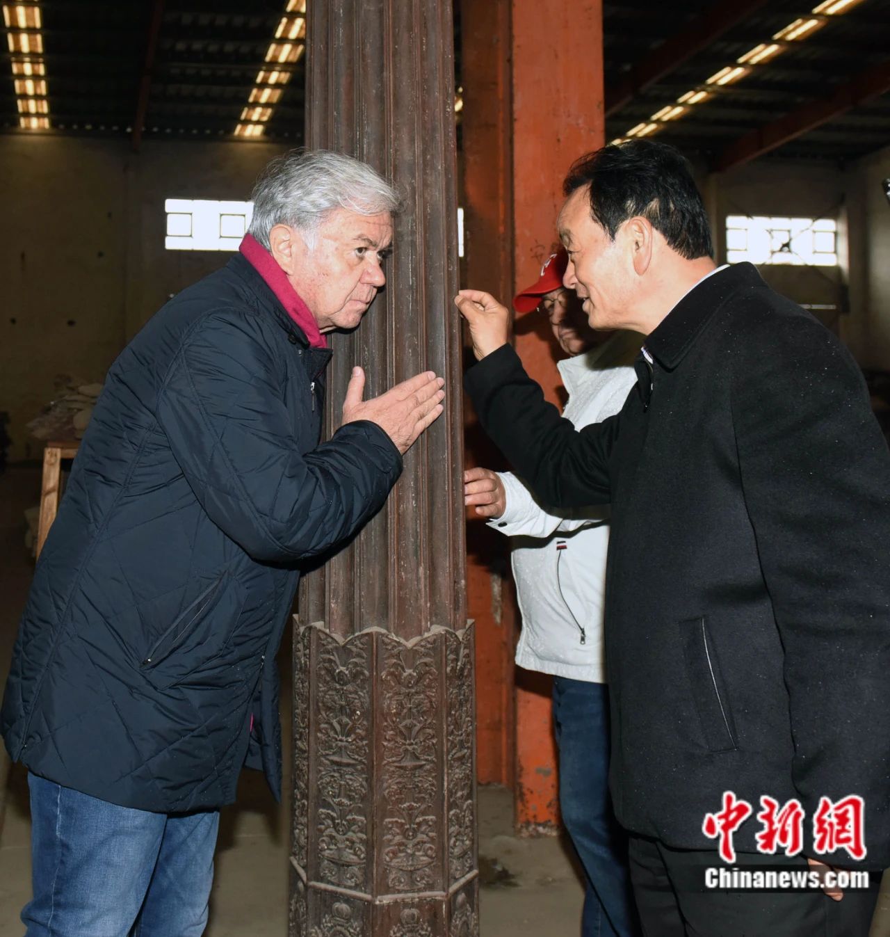 2018年11月7日,拉希德·阿利莫夫(左一)作為時任上合組織秘書長,來到安徽蚌埠“湖上升明月”中華古民居博覽園參觀考察。圖為拉希德·阿利莫夫在細細傾聽來自敲打老木頭的聲音。中新社發(fā) 鐘欣 攝