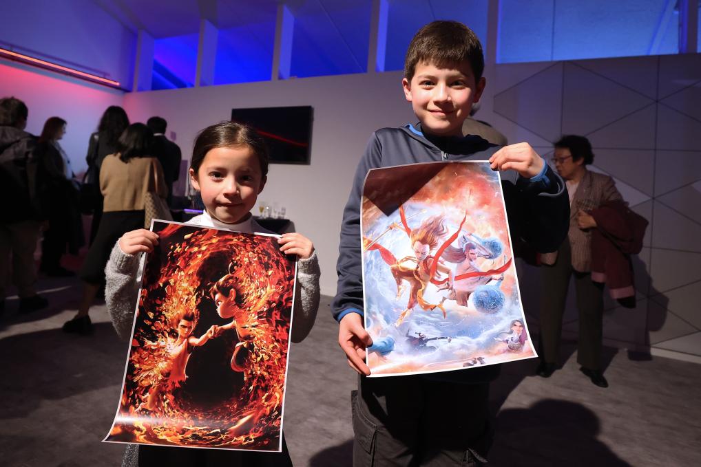 3月26日,在比利時布魯塞爾,小朋友在《哪吒之魔童鬧?!肥子郴顒由鲜殖趾蠛嫌啊P氯A社記者趙丁喆攝