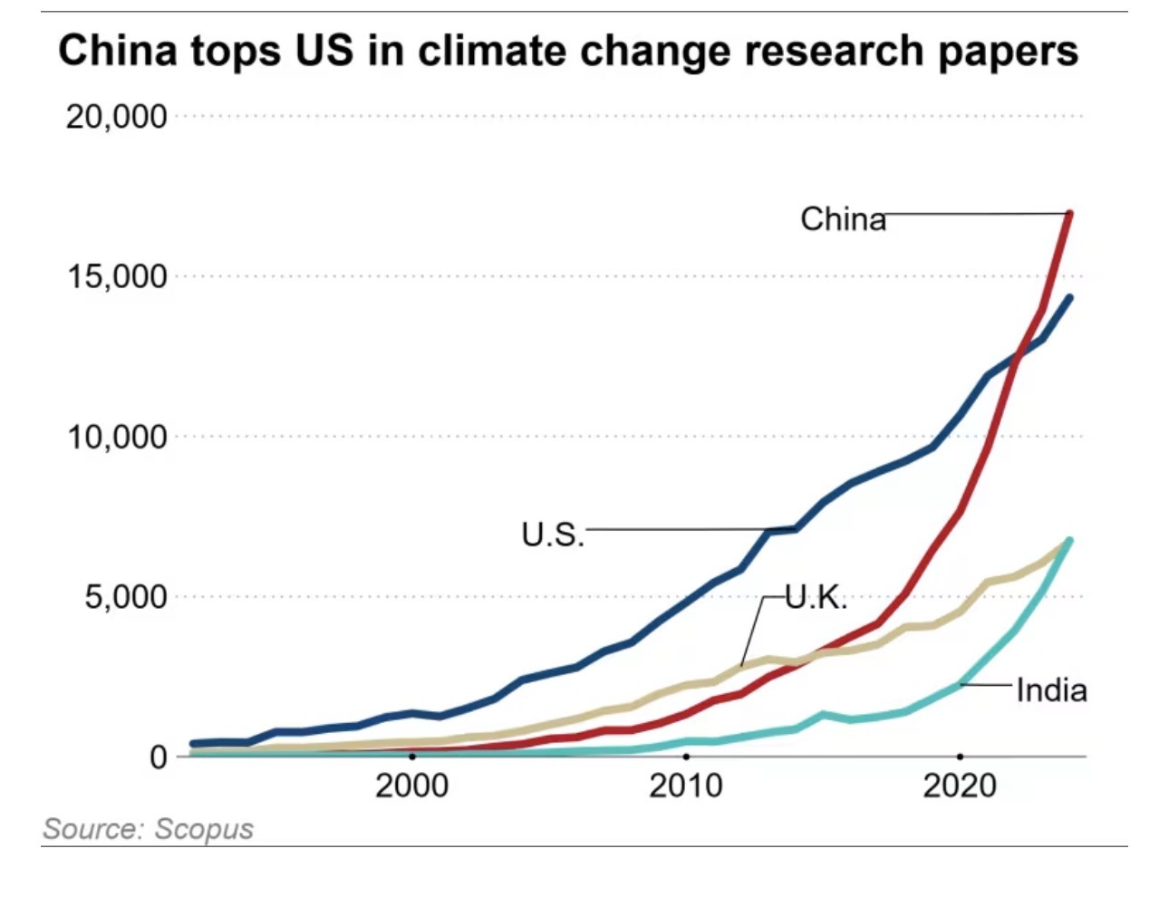 《日經(jīng)亞洲評論》22日發(fā)布的一篇文章指出,中國在2023年發(fā)表的氣候變化研究論文數(shù)量超過了美國,并在次年擴(kuò)大了領(lǐng)先優(yōu)勢。這一趨勢凸顯了中國全球影響力的持續(xù)增長,與此同時,美國卻在逐漸退出這一領(lǐng)域。