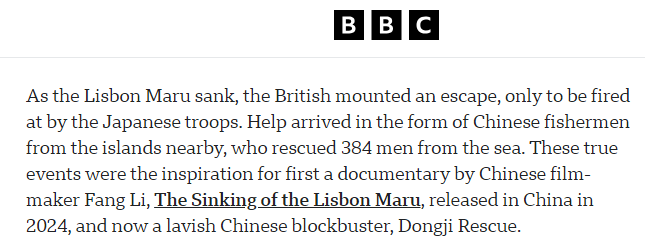 文章說,在這艘載有英軍戰(zhàn)俘的船只“里斯本丸”號沉沒過程中,英國戰(zhàn)俘組織突圍逃生,卻遭到日軍掃射。附近島嶼的中國漁民們伸出了援手,從海中救起384人。這一真實(shí)事件先后催生了兩部影視作品:紀(jì)錄片《里斯本丸沉沒》,以及電影《東極島》。