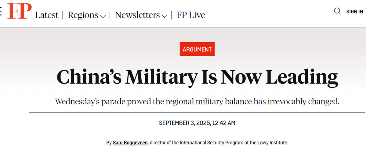 洛伊研究所國際安全項(xiàng)目主任薩姆·羅格維恩在美國《外交政策》網(wǎng)站撰文稱,西方的軍事規(guī)劃人員會對閱兵式上展出的裝備感到驚訝,已經(jīng)不能再說中國軍隊(duì)在迎頭趕上,或者所謂“抄襲”外國軍事裝備設(shè)計(jì),“中國軍備正在創(chuàng)新,并且處于領(lǐng)先地位”。