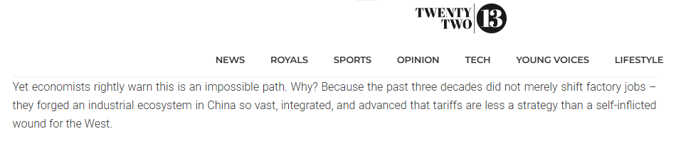 馬來西亞twentytwo13網(wǎng)站8日刊載的一篇署名文章指出,美國政府對幾乎每個國家或地區(qū)的進口商品加征關(guān)稅。許多人認(rèn)為這是美國試圖奪回自己曾經(jīng)擁有的制造業(yè)霸權(quán)的絕望之舉。然而,經(jīng)濟學(xué)家卻警告說,這是一條行不通的路。因為過去三十年不僅僅是美國制造業(yè)崗位的轉(zhuǎn)移——它們在中國構(gòu)建了一個規(guī)模龐大、高度整合且技術(shù)先進的工業(yè)生態(tài)系統(tǒng),以至于關(guān)稅對西方而言更像是一種自我傷害,而非有效的戰(zhàn)略手段。