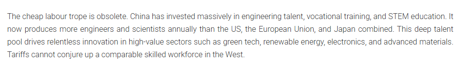 文章說,西方固守保護主義的“打地鼠游戲”,而不是構(gòu)建一套連貫且以投資為導(dǎo)向的產(chǎn)業(yè)戰(zhàn)略,這或?qū)⑹怪袊M一步鞏固自己在全球制造業(yè)中的主導(dǎo)地位。“獲勝需要建設(shè),而不是筑墻。是時候結(jié)束幻想了?!?/p>