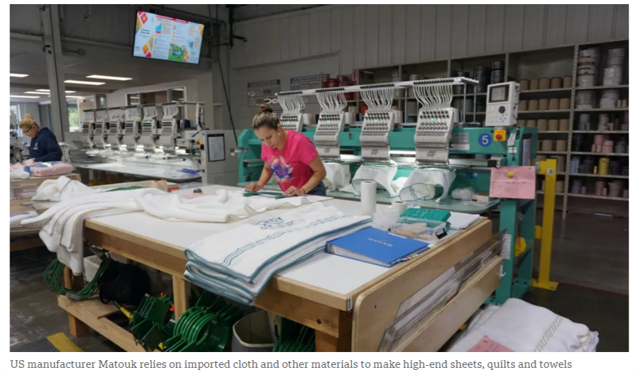 馬圖克表示,從今年4 月到 8 月,關(guān)稅導(dǎo)致其每月增加超過 10 萬美元的成本,因為高額關(guān)稅影響了來自印度和葡萄牙的棉布、來自列支敦士登的羽絨等原材料的供應(yīng)。不僅如此,增加的成本還迫使企業(yè)削減了在新設(shè)備以及營銷方面的開支。喬治 馬圖克說,他“沒有從關(guān)稅中看到任何好處”。