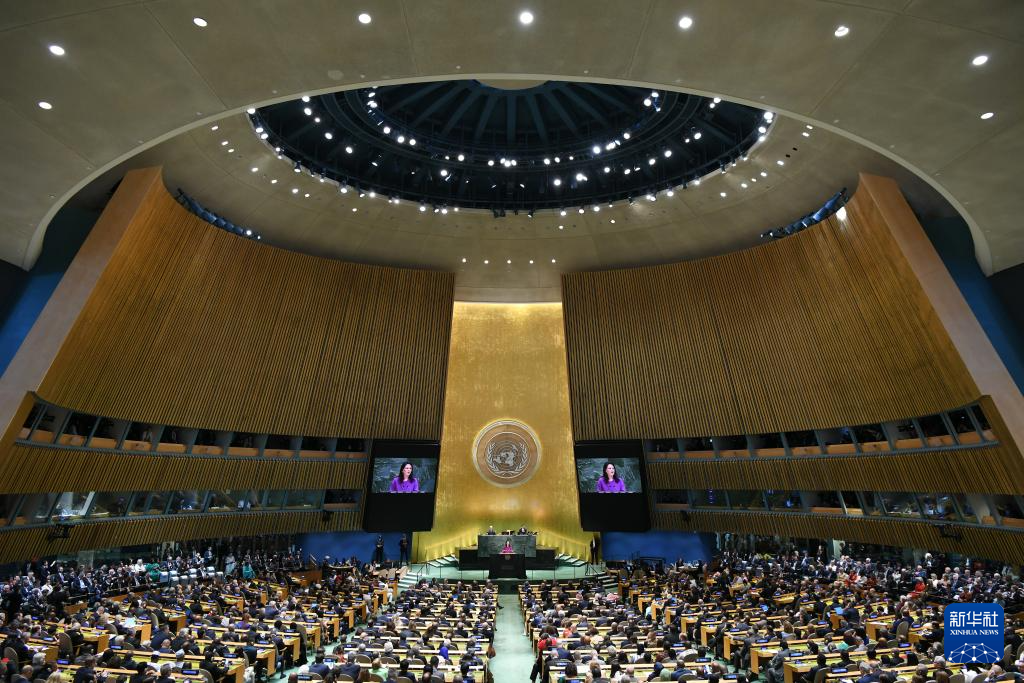 9月23日,在位于紐約的聯(lián)合國總部,第80屆聯(lián)大主席貝爾伯克(中)主持第80屆聯(lián)合國大會一般性辯論開幕式。新華社記者吳曉凌攝