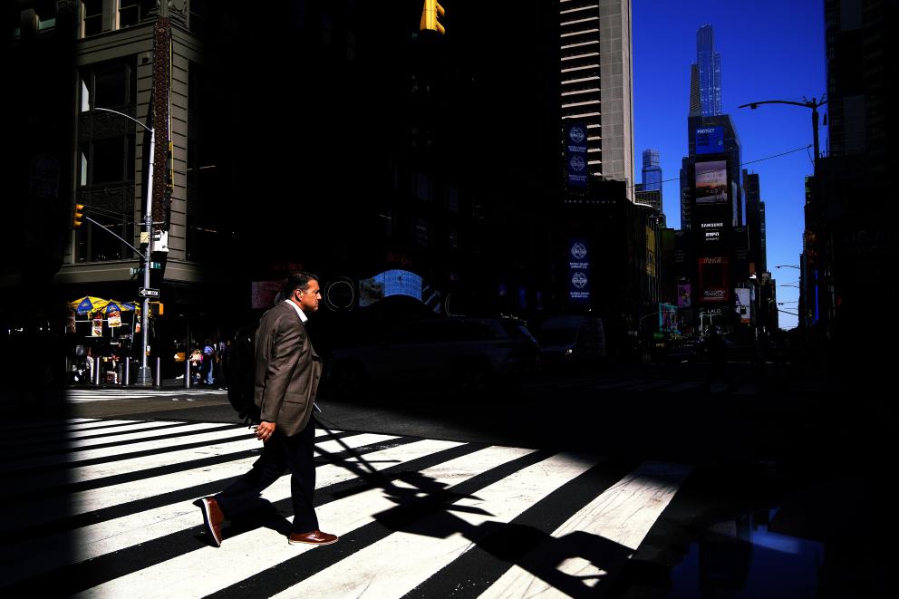 10月1日,在美國(guó)紐約曼哈頓的時(shí)報(bào)廣場(chǎng)附近,行人通過(guò)人行橫道斑馬線過(guò)馬路。新華社記者吳曉凌攝