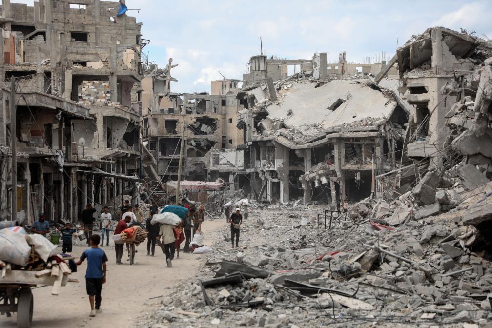 10月12日,在加沙地帶南部汗尤尼斯,重返家園的巴勒斯坦人走過(guò)嚴(yán)重受損的建筑。新華社發(fā)(里澤克·阿卜杜勒賈瓦德攝)