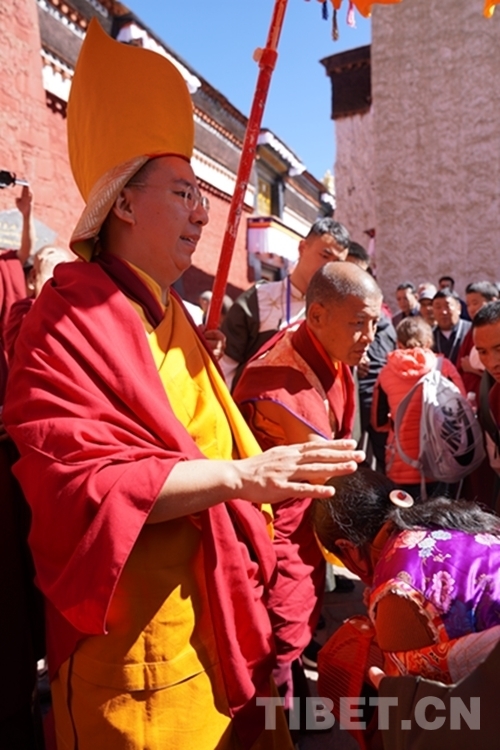在朝拜過(guò)程中,班禪數(shù)度憑欄駐足,向信眾、游客揮手致意,并兩次為信教群眾摸頂賜福。