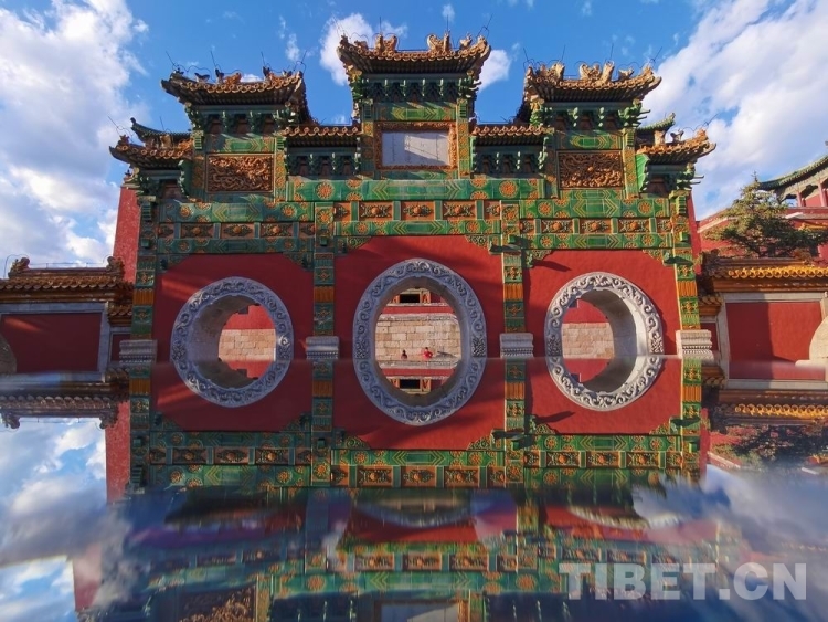 圖為須彌福壽之廟主體建筑大紅臺(tái)前象征神權(quán)、皇權(quán)的琉璃牌坊。能通過(guò)它的只有皇帝、親王、郡王、貝勒、貝子及三品以上臺(tái)吉 攝影:歐帆