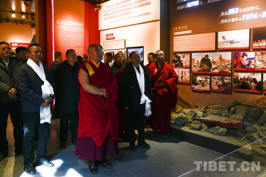 圖為第十一世班禪額爾德尼·確吉杰布在定日縣6.8級(jí)地震受災(zāi)影響最嚴(yán)重的村莊之一森嘎村村史館調(diào)研災(zāi)后重建情況 攝影:趙振宇