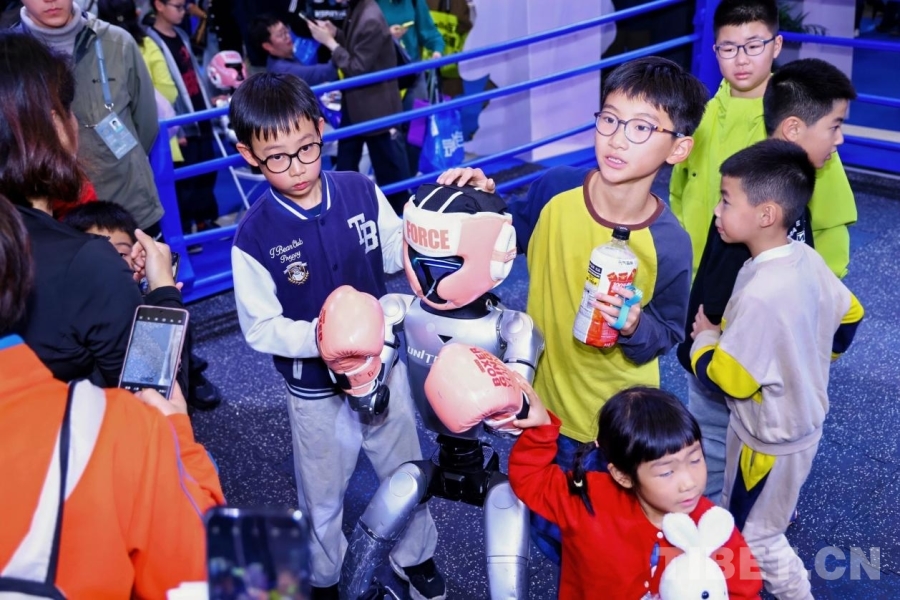 圖為小朋友們競(jìng)相與機(jī)器人拳手互動(dòng)。