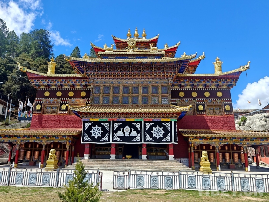 在西藏自治區(qū)林芝市波密縣城旁的半山腰上,有一座寧瑪派寺廟——多東寺。這里視野開(kāi)闊,可以俯瞰波密縣城全景,寺院四周古木參天,紅墻金頂掩映在翠綠山林之間格外醒目。