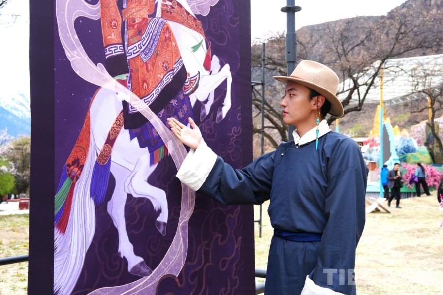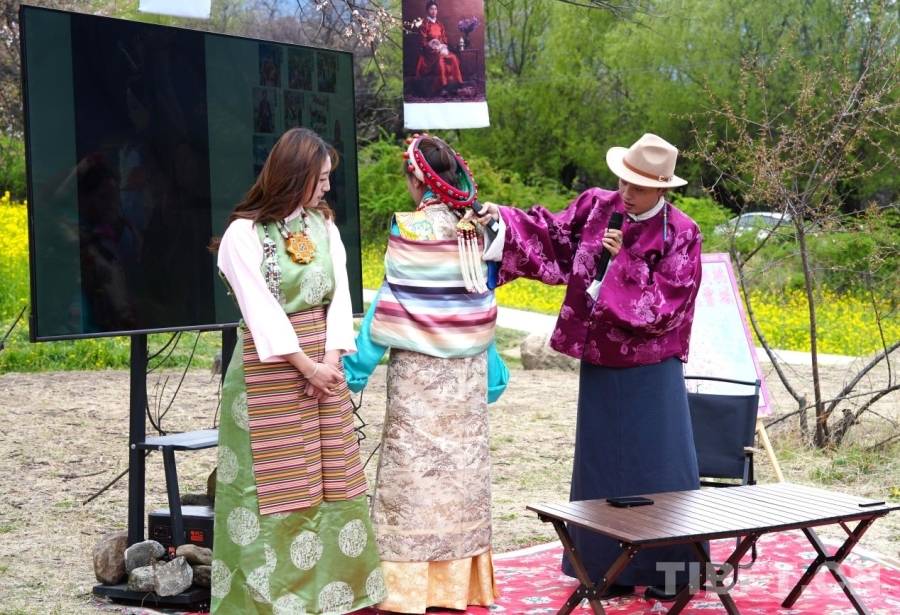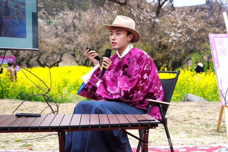 4月4日,班珠丹塔在林芝嘎拉桃花源的“綺裳映桃·旖旎雪域——班珠丹塔服飾研究藝術(shù)展”上做分享 攝影:張藝彤