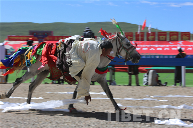 圖為一名騎手在表演馬上拾哈達 攝影:王媛媛