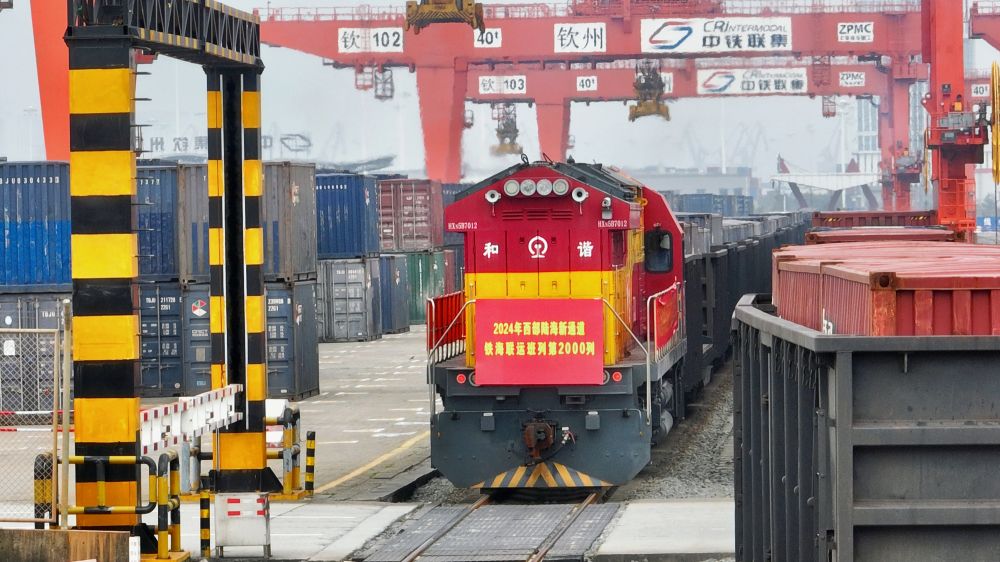 3月17日上午,一列滿載緬甸黑芝麻、海南椰子汁、廣西白糖等貨物的海鐵聯(lián)運(yùn)班列,從欽州鐵路集裝箱中心站緩緩發(fā)出駛向四川城廂站。這是2024年西部陸海新通道開行的第2000列海鐵聯(lián)運(yùn)班列,同比增長16.8%,提前14天完成一季度班列開行任務(wù)。