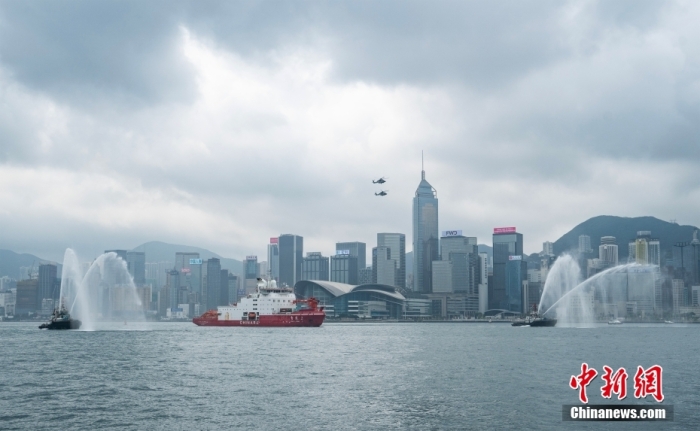 4月8日上午,中國(guó)首艘自主建造的極地科學(xué)考察破冰船“雪龍2”號(hào)抵達(dá)香港。圖為“雪龍2”號(hào)通過(guò)維多利亞港時(shí)收到海事傳統(tǒng)噴水歡迎。中新社記者 侯宇 攝