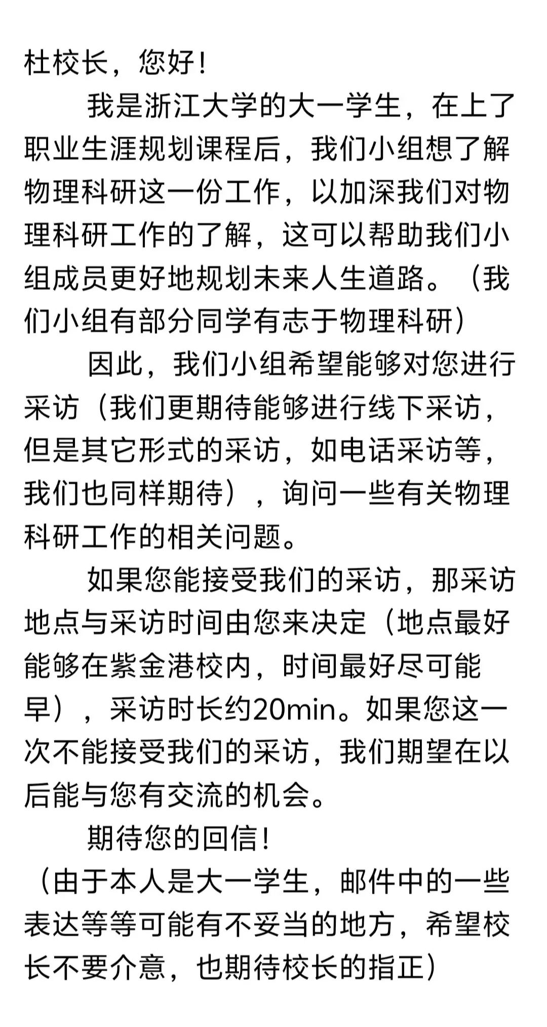 向校長杜江峰發(fā)了一封郵件