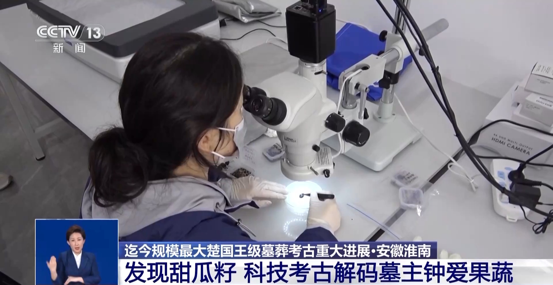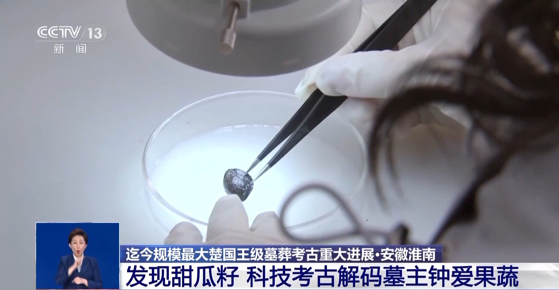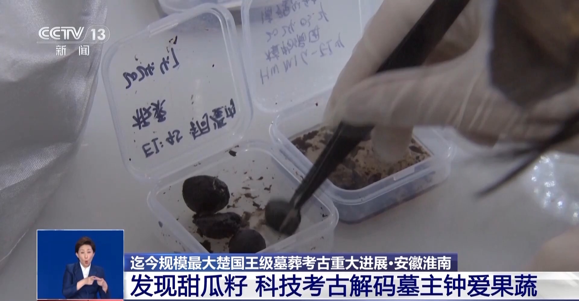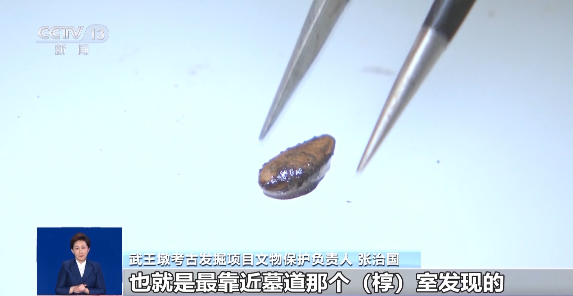 武王墩考古發(fā)掘項(xiàng)目文物保護(hù)負(fù)責(zé)人 張治國:發(fā)現(xiàn)大部分的這個里面都是一些樹葉,然后還有果核,可能還有一些草編的痕跡,目前初步鑒定出來的有甜瓜籽,然后還有一些梅核。