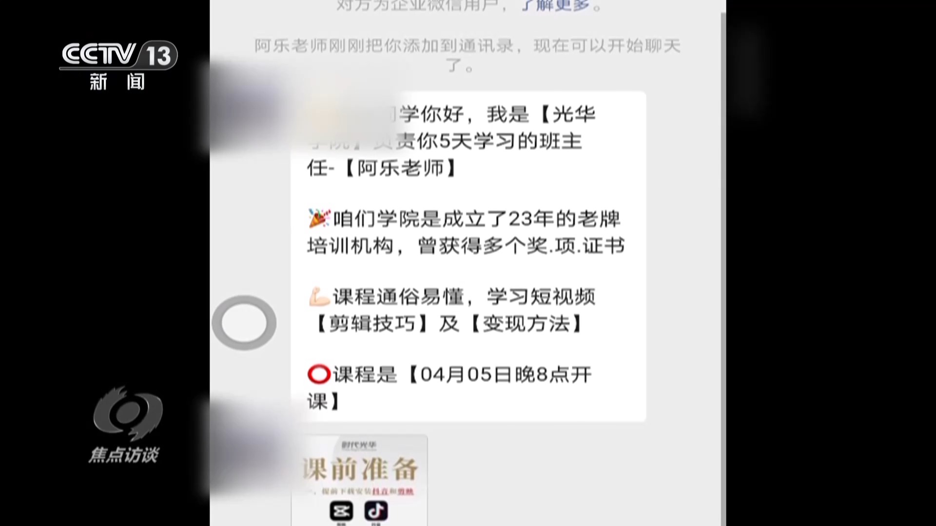 黃先生的遭遇并不是個案。記者瀏覽多個網(wǎng)絡(luò)平臺,發(fā)現(xiàn)類似的廣告比比皆是,五花八門,0元學(xué)配音、0元學(xué)書法、0元學(xué)易經(jīng)……記者隨機(jī)點(diǎn)開了一家賬號主體為北京時代光華科技有限公司的0元5天剪輯直播課,添加所謂的老師微信之后就被拉進(jìn)了一個微信群,4月5日晚上8點(diǎn),課程開始了。