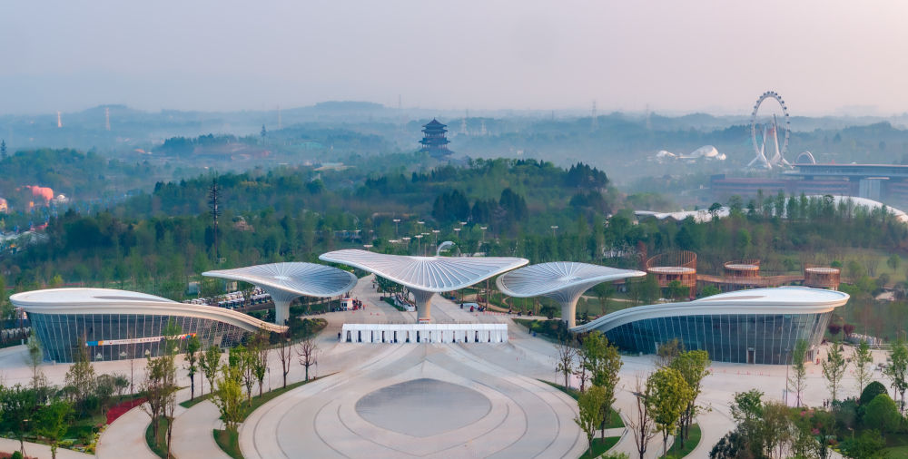 窗含千秋,門泊萬里。從空中俯瞰,2024年成都世界園藝博覽會主會場如同一朵盛放的芙蓉花,迎接世界各方賓朋。
