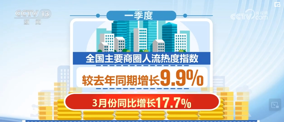 國(guó)家信息中心數(shù)據(jù)就顯示,一季度,全國(guó)主要商圈人流熱度指數(shù)較2023年同期增長(zhǎng)9.9%,其中,3月份同比增長(zhǎng)17.7%。