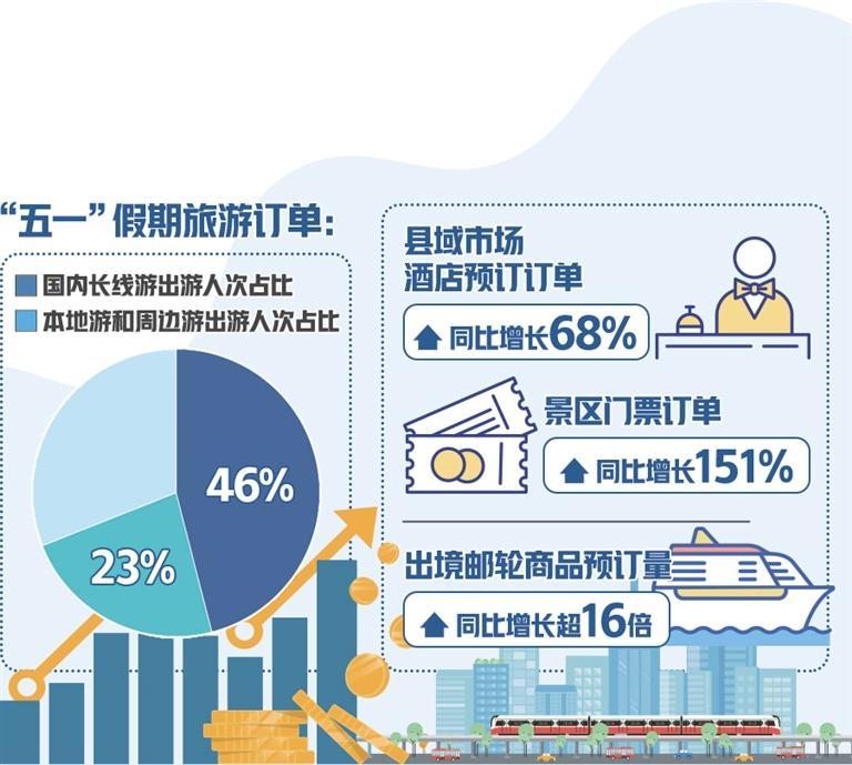 從出游目的地看,北京、上海、重慶、杭州、成都、南京、西安、武漢、廣州等城市是熱門,帶動相關交通和酒店訂單量走高。去哪兒旅行網(wǎng)顯示,北京—上海、成都—西安、上?!錆h、深圳—長沙、北京—青島等熱門線路的火車票預約購票難度不低于春運;從上海、北京、深圳、廣州、杭州、南京等地出發(fā),飛往旅游城市的機票平均支付價格走高,北京—成都、上海—昆明等熱門航線的部分航班已升至全價;在攜程旅行網(wǎng)上,天水、徐州、淄博、合肥、南昌、迪慶、煙臺等城市的“五一”假期酒店預訂增速明顯;四線及以下城市,尤其是縣域旅游市場帶來新增量,縣域市場酒店預訂訂單同比增長68%、景區(qū)門票訂單同比增長151%。