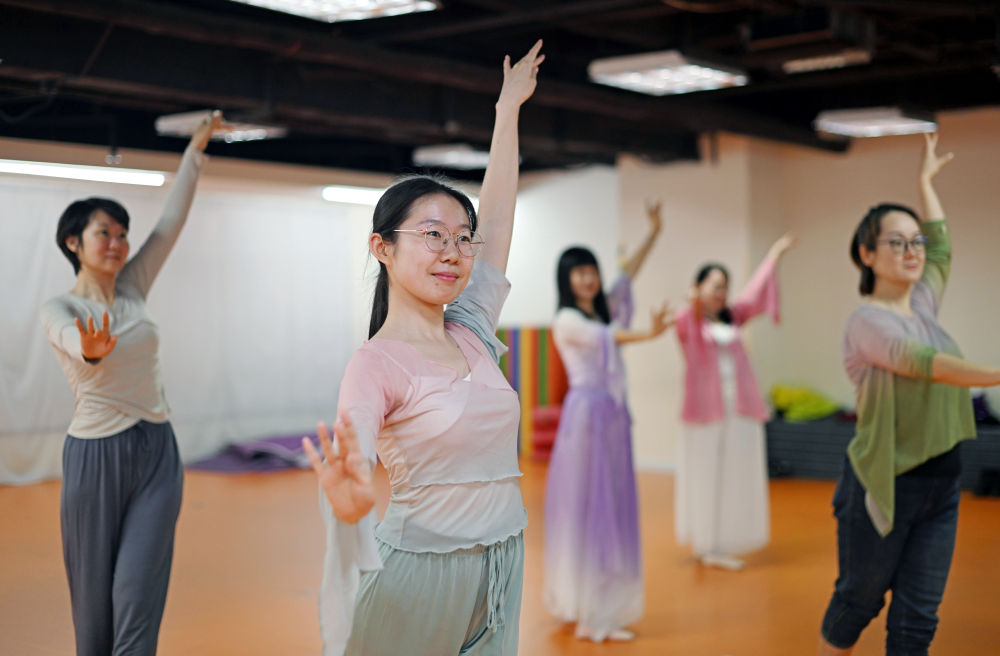 ↑4月23日,在天津青年宮,學(xué)員呂昕蕾(前)等在青年夜校民族舞課上練習(xí)。