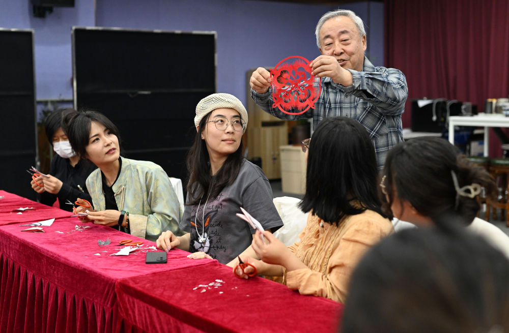 ↑4月24日,在天津市河西區(qū)春秋文化藝術(shù)中心,河西區(qū)青年夜校教師在剪紙體驗課上展示學(xué)員作品。