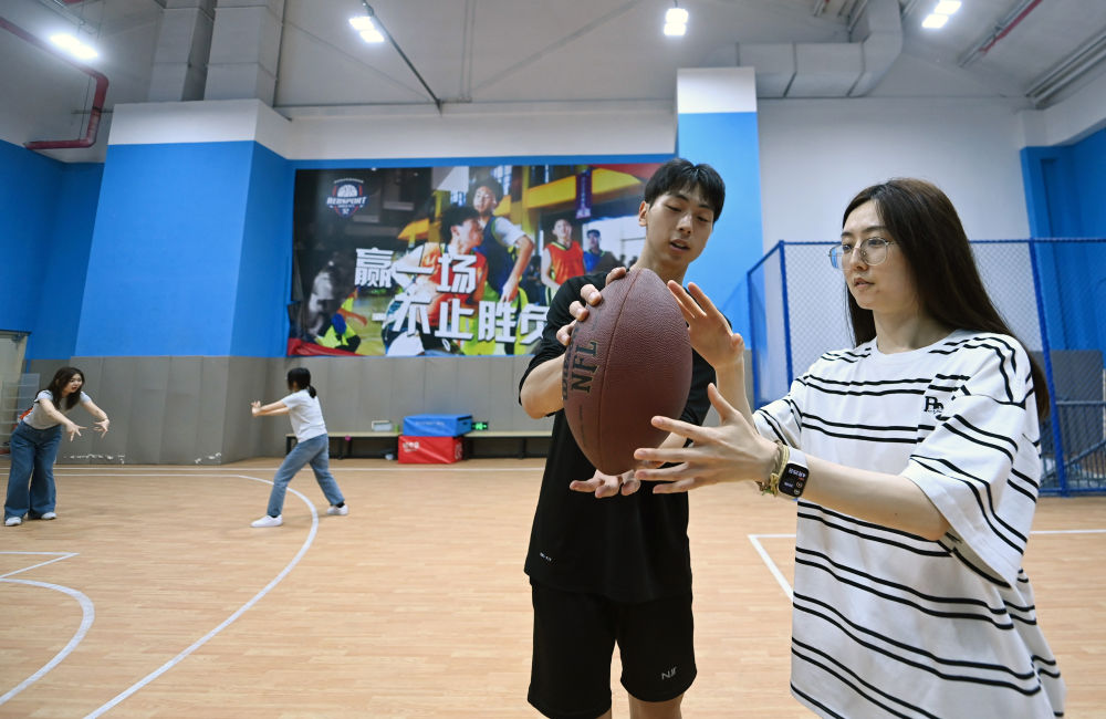 ↑4月25日,在天津市南開區(qū)瑞步青少年籃球俱樂部,南開區(qū)青年夜校教師指導(dǎo)學(xué)員練習(xí)腰旗橄欖球。