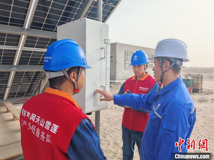 國(guó)網(wǎng)阿克蘇供電公司工作人員來到沙雅中電建25萬千瓦光伏項(xiàng)目現(xiàn)場(chǎng),檢查光伏場(chǎng)站逆變器運(yùn)行情況。(馬海驕 攝)