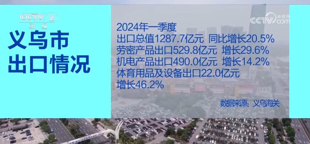 數(shù)據(jù)顯示,2024年一季度,義烏市出口總值達1287.7億元,同比增長20.5%。其中,勞密產品出口529.8億元,增長29.6%;機電產品出口490.0億元,增長14.2%;而體育用品及設備出口達到22.0億元,增長46.2%。業(yè)內人士表示,巴黎奧運會即將召開,以及外商圣誕采購季開始,歐美市場補庫存需求增加,使得相關產品出口占比顯著提升。