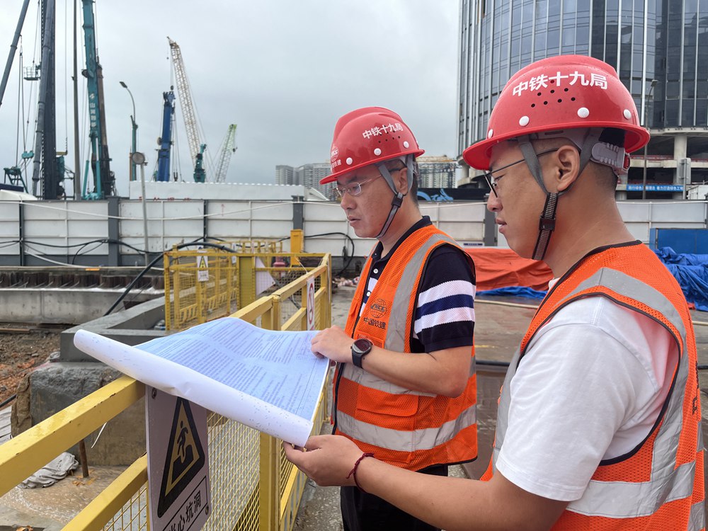 2024年4月26日,深圳市五一勞動獎章獲得者、中鐵十九局軌道公司項目副經(jīng)理夏荔(左)在穗莞深城際鐵路前皇段皇崗口岸站建設現(xiàn)場忙碌。新華社發(fā)