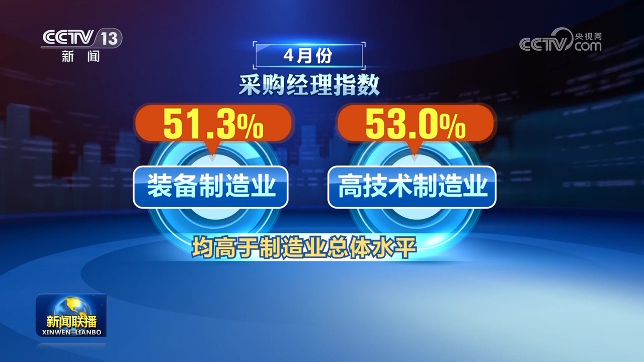 新動能繼續(xù)較快擴(kuò)張。4月份裝備制造業(yè)和高技術(shù)制造業(yè)采購經(jīng)理指數(shù)分別為51.3%和53.0%,均高于制造業(yè)總體水平。