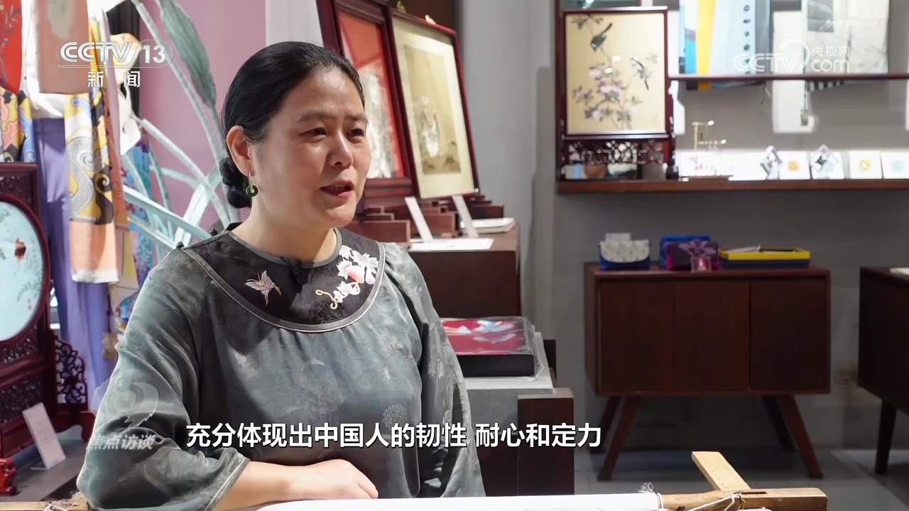 盧建英:“當(dāng)時我在繡一幅《桃花太平鳥圖》,習(xí)近平總書記走到了我的繃架前。他說你好,很親切,很和藹,看得非常仔細。他說中華文化的傳承力有多強,通過這個蘇繡可以看出來,像這樣的功夫充分體現(xiàn)出中國人的韌性、耐心和定力,這是中華民族精神的一部分,能得到總書記的認(rèn)可,真的是倍感榮耀。”