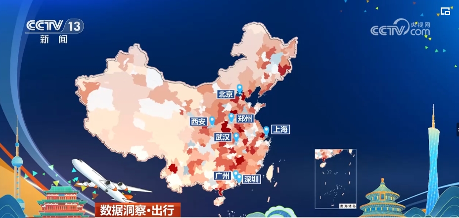 這是一張根據(jù)12306火車票預(yù)售數(shù)據(jù)繪制的熱力圖,紅色越深代表在5月1日乘火車凈流入到這個(gè)城市的人越多,藍(lán)色越深則表示凈流出這里的人越多??梢钥吹?,北上廣深、武漢、鄭州、西安等中心城市是凈流出人數(shù)較多的城市。