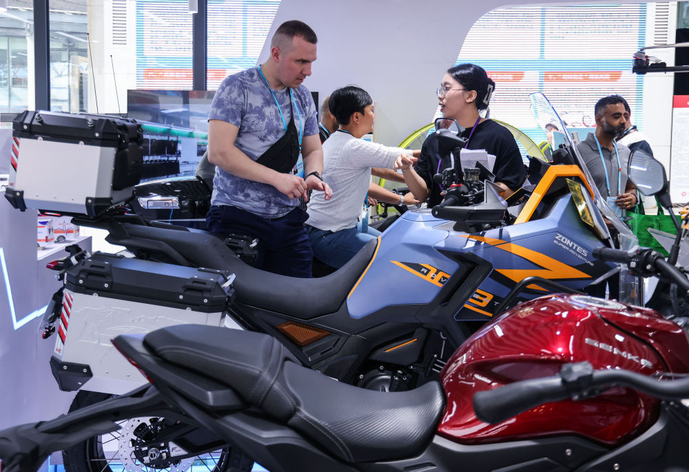 2024年4月15日,采購(gòu)商在第135屆廣交會(huì)上了解摩托車(chē)產(chǎn)品。新華社記者 劉大偉 攝