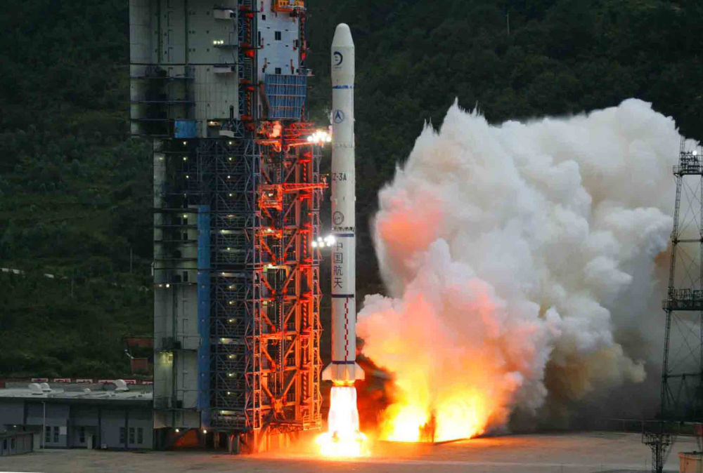 2007年10月24日18時(shí)05分,搭載著我國(guó)首顆探月衛(wèi)星嫦娥一號(hào)的長(zhǎng)征三號(hào)甲運(yùn)載火箭在西昌衛(wèi)星發(fā)射中心三號(hào)塔架點(diǎn)火發(fā)射。新華社記者 李剛 攝