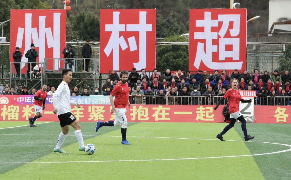 ↑2024年2月26日,中法青年友誼賽在貴州榕江“村超”足球場舉行。