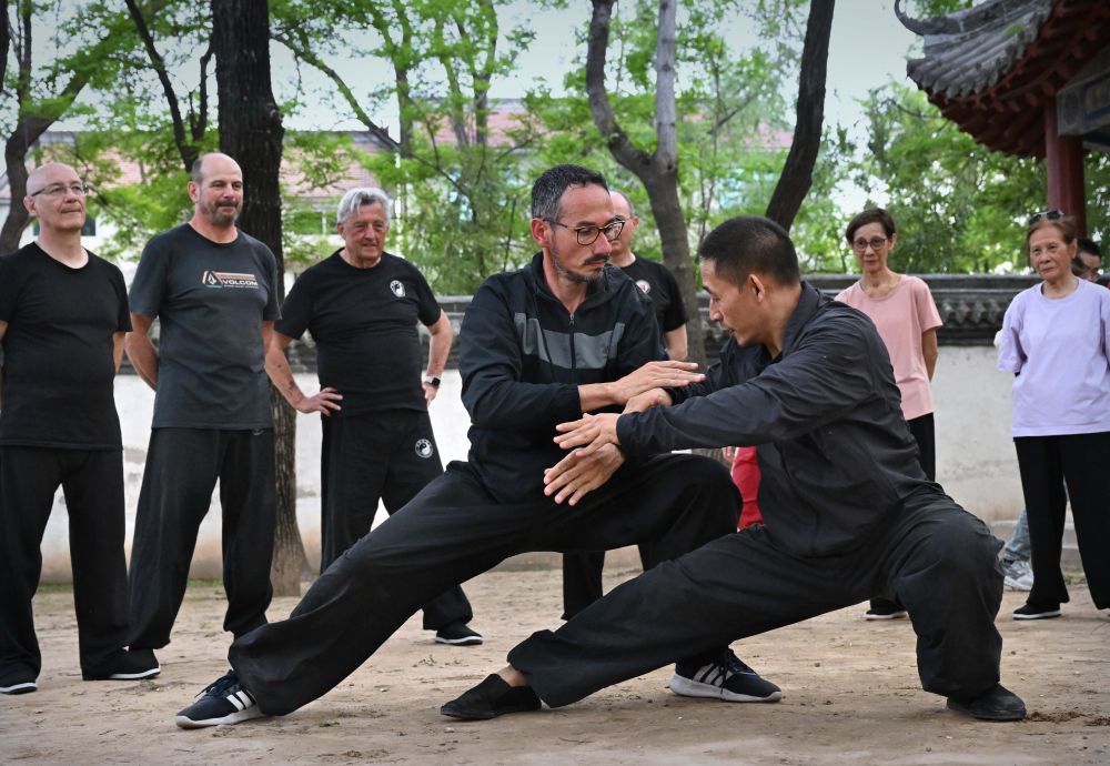↑2024年4月20日,在河南溫縣陳家溝楊露禪學拳處,來自法國波爾多的陳少拳(左)與師父陳自強交流太極推手。