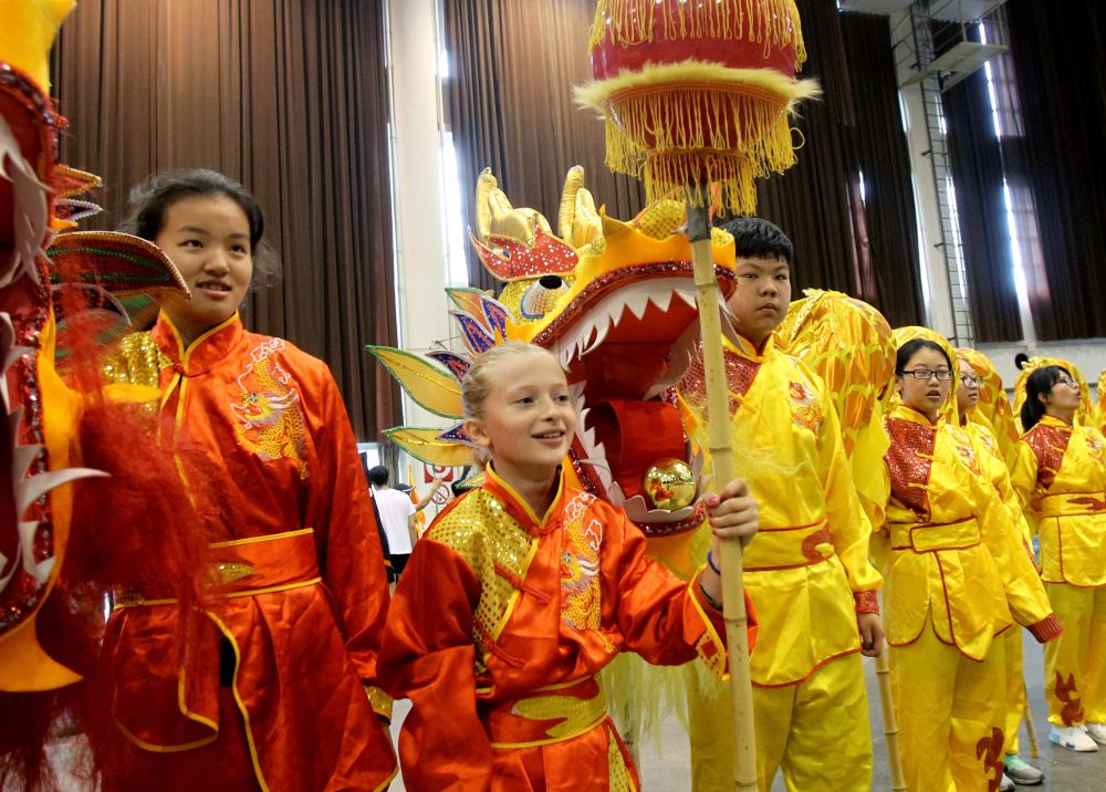 ↑2016年6月9日,上海向明初級中學的學生、法國女孩凱米(左二)在學校龍獅隊中擔任引獅人的表演任務。