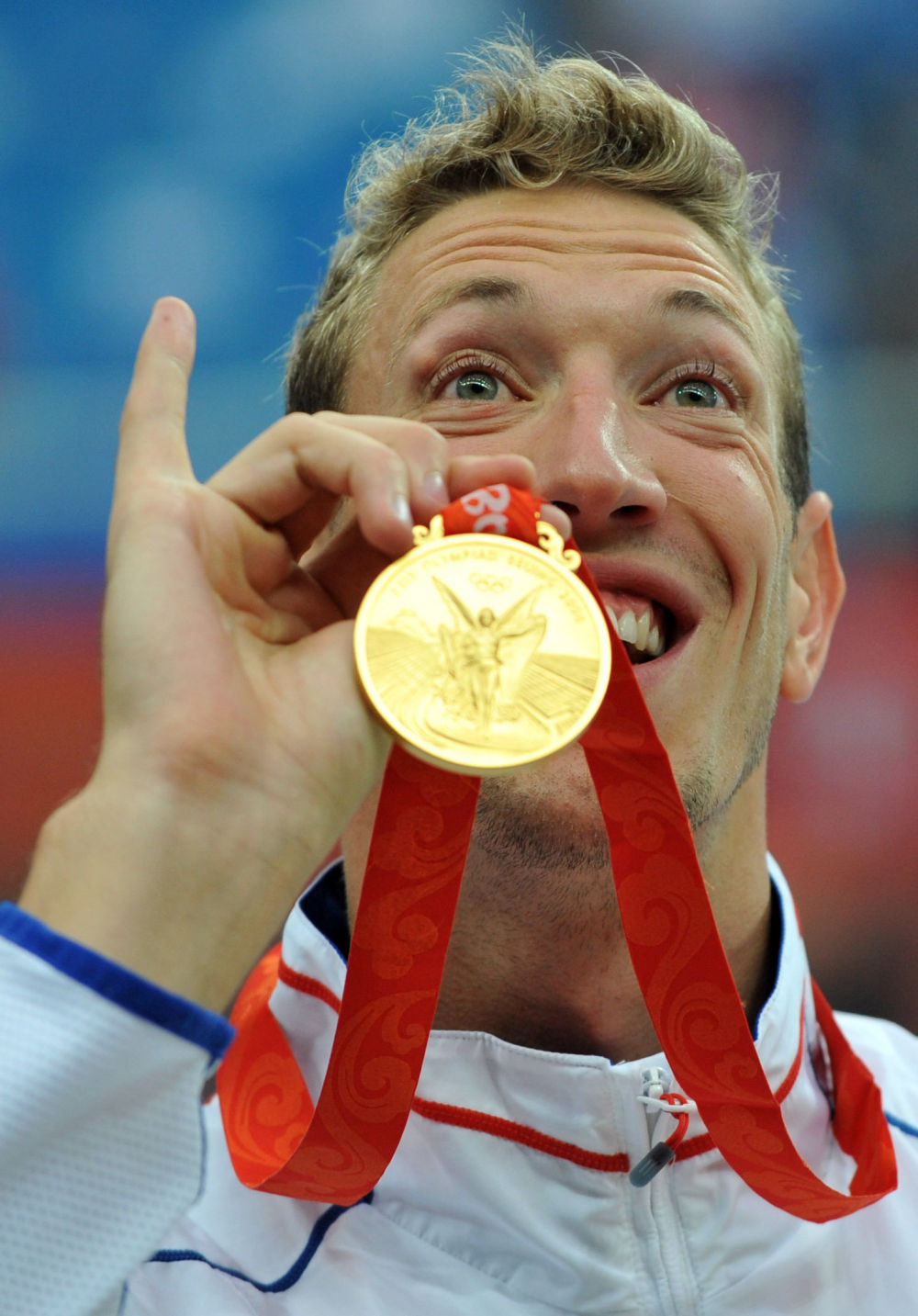 ↑2008年8月14日,法國選手阿·貝爾納在北京奧運會男子100米自由泳頒獎儀式后展示金牌。