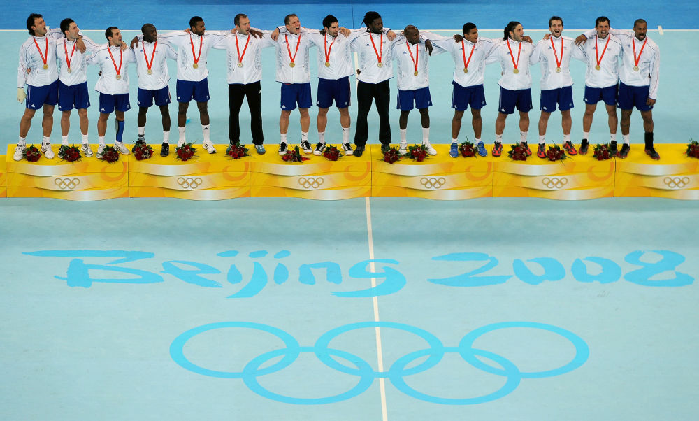 ↑2008年8月24日,法國隊球員在北京奧運會男子手球冠軍領獎臺上高唱國歌。