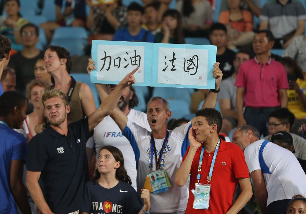 ↑2014年8月25日,一名法國觀眾在南京青奧會田徑項目男子標槍決賽場邊高舉用中文書寫的“加油法國”標語為法國選手盧卡斯·穆塔德加油。
