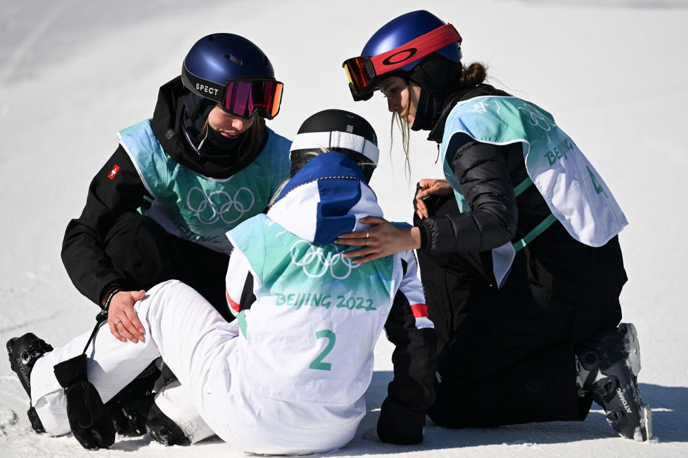 ↑2022年2月8日,中國選手谷愛凌(右)和瑞士選手瑪?shù)贍柕隆じ窭啄拢ㄗ螅┰诒本?022年冬奧會自由式滑雪女子大跳臺決賽后安慰法國選手泰絲·勒德。奧運賽場外中法體育界展開多領域交流與合作2011年6月法網(wǎng)賽場上演中國奇跡29歲的中國姑娘李娜成為第一個奪得網(wǎng)球大滿貫賽事單打冠軍的亞洲人