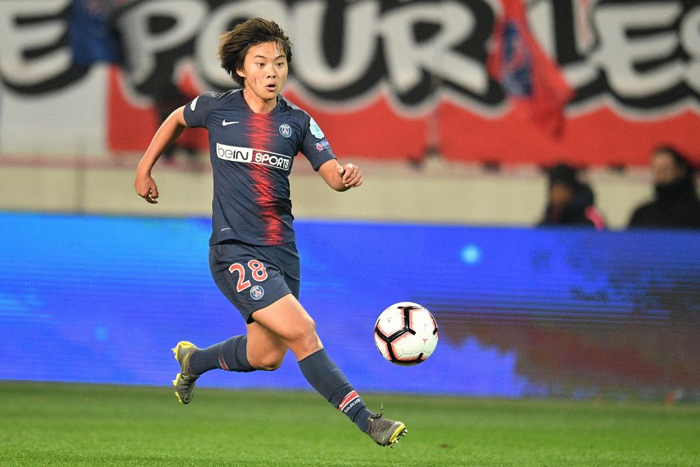 ↑2019年3月27日,巴黎圣日耳曼隊球員王霜在在女足歐冠1/4決賽次回合與切爾西隊的比賽中帶球突破。跟隨王霜的腳步 2022年,李夢雯、楊莉娜相繼加盟巴黎圣日耳曼俱樂部