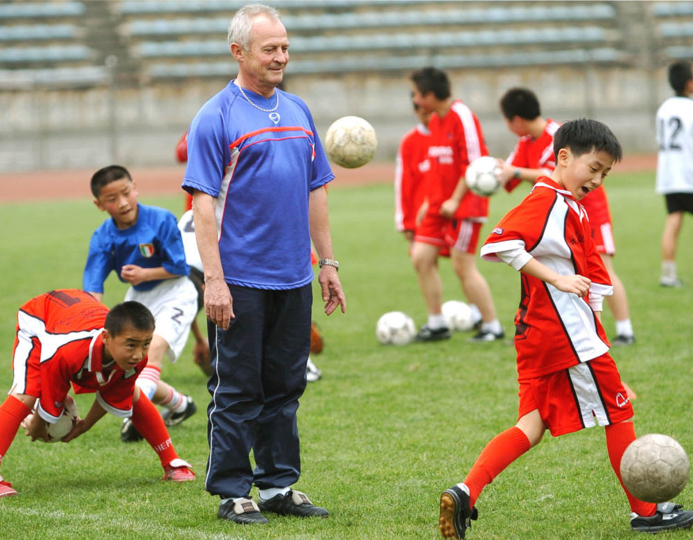 ↑2004年4月11日,法國青少年足球專家艾迪·米歇爾·于當希(中)應邀在貴陽輔導小學員訓練。